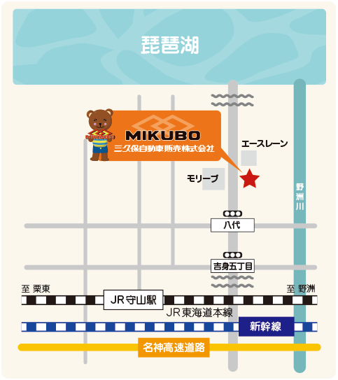 ③10分ほどお進み頂くと左手にモリーブが見えます。モリーブの向かいが三久保自動車ですので、大きく右方向に曲がってお入りください。